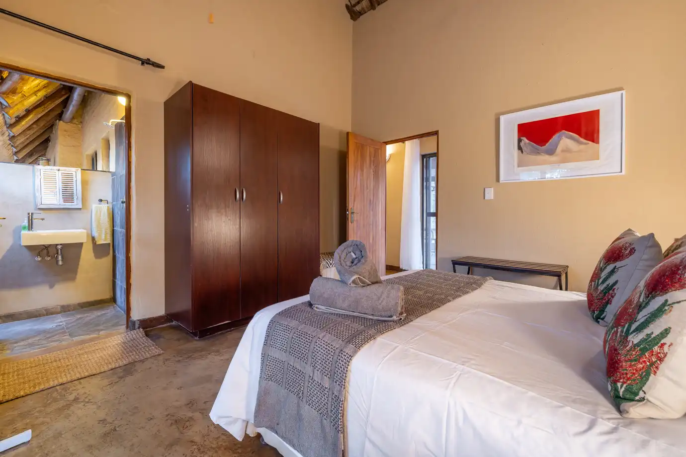 Hoedspruit Bush Cottage sleeps up to four guests across two spacious, air-conditioned bedrooms. The main bedroom features a queen-size bed and its own private outdoor bathroom, offering a unique and refreshing way to start or end your day. The second bedroom has a king-size bed that can easily be split into two singles, ideal for friends or kids.