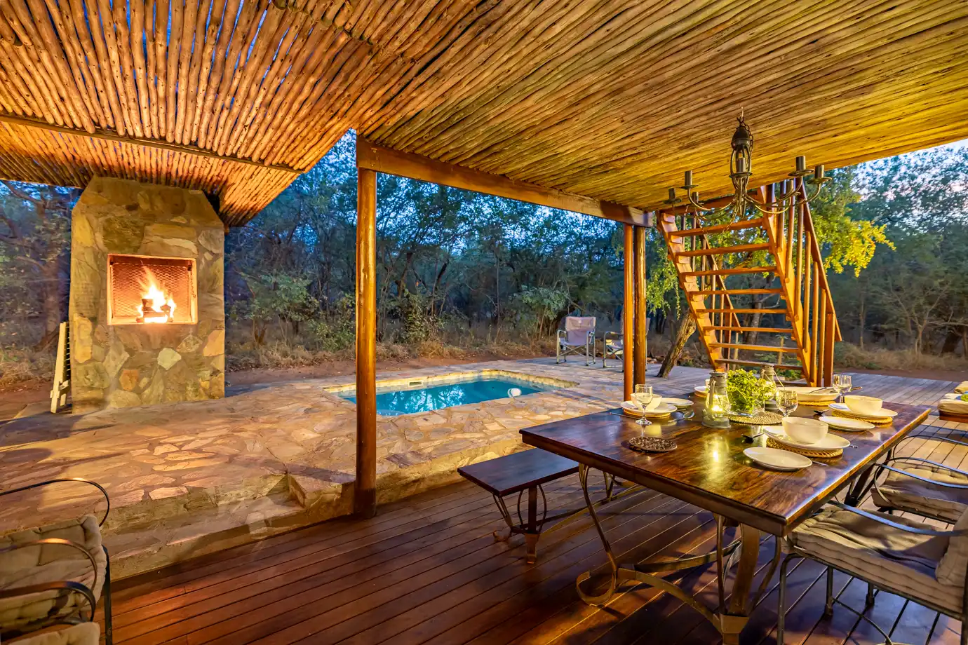 Outside, you’ll find a shaded patio with a built-in braai, dining table, and pool loungers, ideal for al fresco meals or lazy afternoons. A plunge pool offers a great way to cool off, and a raised wooden deck gives you a perfect spot to enjoy sundowners or do a bit of birdwatching.